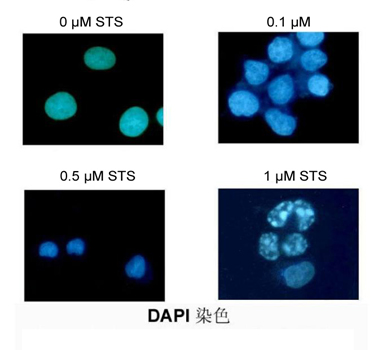 操作流程:使用不同濃度星飽菌素(Staurosporine,STS)凋亡處理Jurkat細胞。調整細胞密度為1×106/ml,每孔2 ml接種于六孔板中;加入終濃度為0,0.1,0.5,1 μM STS,37℃ 5%CO2培養3小時(shí);500 g 3 min收集細胞;細胞沉淀中加入1 ml固定液,常溫固定10 min;1×PBS漂洗兩次;細胞沉淀中加入0.5 ml DAPI染色液,37℃避光染色10 min;離心后細胞沉淀重懸于100 μl 1×PBS中;取5 μl細胞懸液滴于載玻片上,加5 μl 抗熒光淬滅劑,封片觀(guān)察。