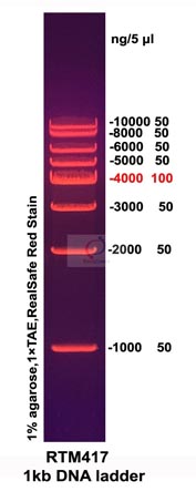 本產(chǎn)品為即用型產(chǎn)品,已含有1×loading buffer,可根據實(shí)驗需要,直接取2-5μl電泳,使用方便,電泳圖像清晰。本產(chǎn)品中8條帶分為1000(50 ng/5 μl),2000(50 ng/5 μl),3000(50 ng/5 μl),4000(100 ng/5 μl),5000(50 ng/5 μl),6000(50 ng/5 μl),8000(50 ng/5 μl),10000bp(50 ng/5 μl)。其中4000bp條帶加亮顯示。