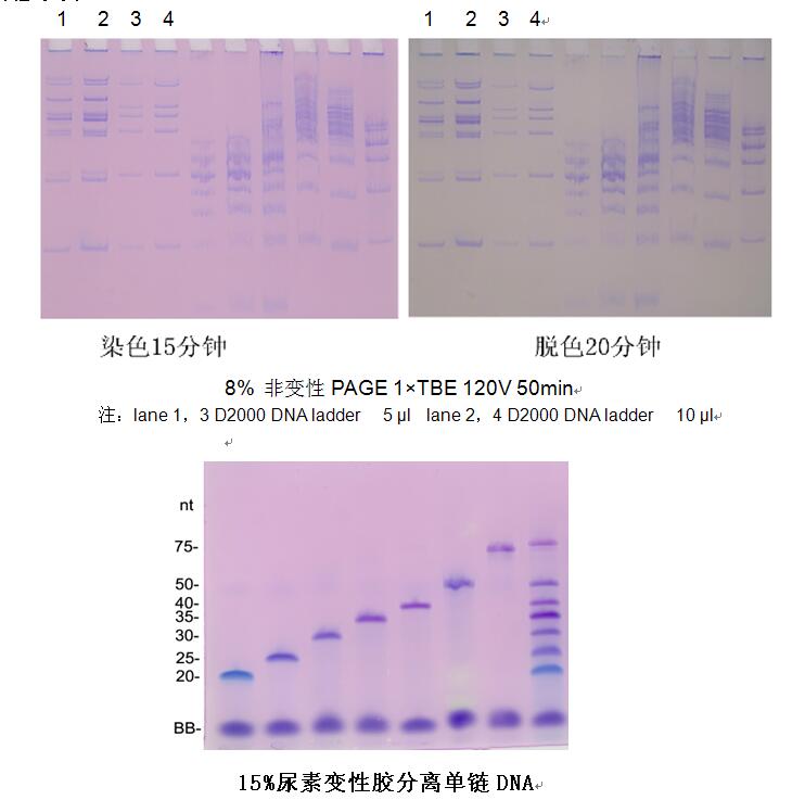核酸PAGE電泳染色試劑盒(PAGE Stain Kit for Nucleic Acids)是一種快速簡(jiǎn)單、可用于聚丙烯酰胺凝膠中的核酸檢測的試劑盒。采用新型染色劑,電泳結束后可以直接染色凝膠,不用借助任何成像儀器,既能觀(guān)察核酸條帶。該方法能檢測到下限10ng的 DNA條帶,常用于檢測 SSR 標記、SNP 標記等。