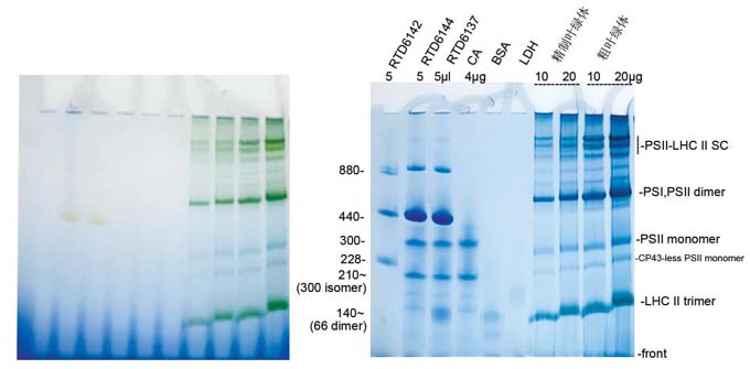 程序:取0.1克新鮮綠蘿葉片加入到離心柱內,加入0.1 ml提取緩沖液,研磨20次,再加入0.3 ml提取緩沖液(平行做6管);4度 2000g 離心5分鐘;棄上清,沉淀中加入0.1ml漂洗緩沖液,合并6管得到0.6 ml粗葉綠體,保留0.2ml粗葉綠體。取0.1ml粗葉綠體加到1ml即用型梯度分離液上層(0.4 ml密度梯度分離試劑加0.6ml漂洗緩沖液),平行做4管;4度 4200g 離心10分鐘,棄上清,沉淀中加入0.5ml漂洗液清洗一次,4度 4200g 離心5分鐘,4管精制葉綠體沉淀合并收集于0.1ml漂洗液中。用乙醇方法測定葉綠體濃度,調整粗葉綠體和精制葉綠體濃度均為1μg Chl/μl;取50μl葉綠體溶液,離心,沉淀中加入50 μl類(lèi)囊體膜增溶緩沖液,冰浴10分鐘,4度 16000g 離心10分鐘取上清,加入1/10體積類(lèi)囊體膜上樣緩沖液(10×),此時(shí)葉綠體蛋白濃度為1μg/μl,上樣10 μl和20 μl。